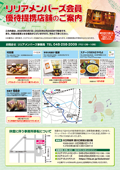 (公財)川口総合文化センターが指定する公演のチケットを、割引価格にてお買い求めいただけます。