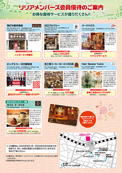 リリア館内ほか、提携店舗での優待サービスが受けられます。