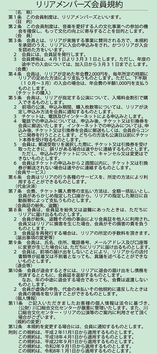 リリアメンバーズの会報「公演一覧表」を毎月、リリアのイベント・チケット情報が満載の「リリアプレス」を隔月にご自宅へお送りいたします。
